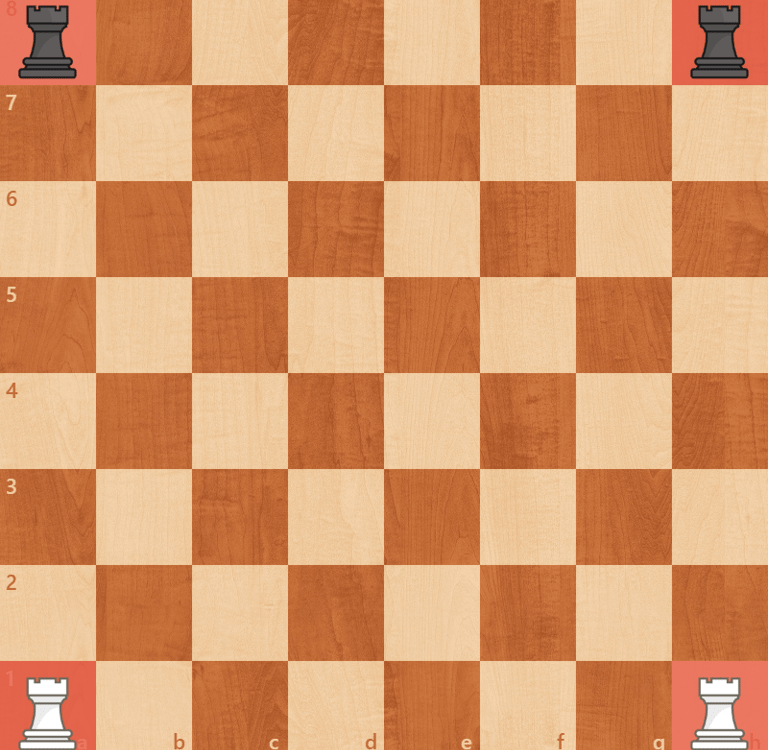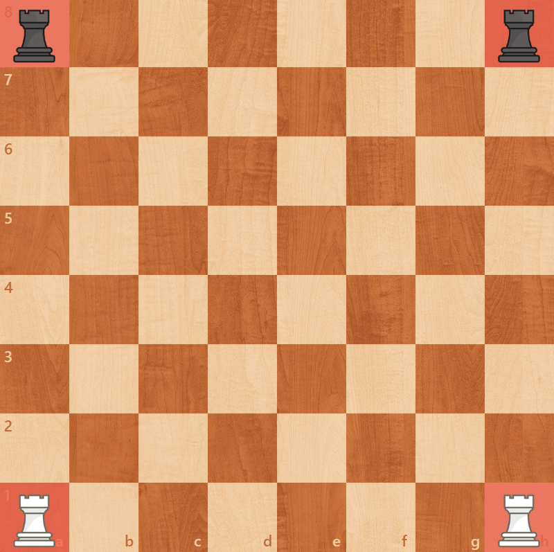 The white and black rooks are located at squares a1, h1 and a8, h8 - as illustrated in the diagram.